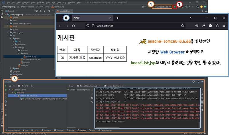 Tomcat_버전 옆에 [▶( Run )] 버튼을 클릭하면 브라우저가 자동으로 실행되고