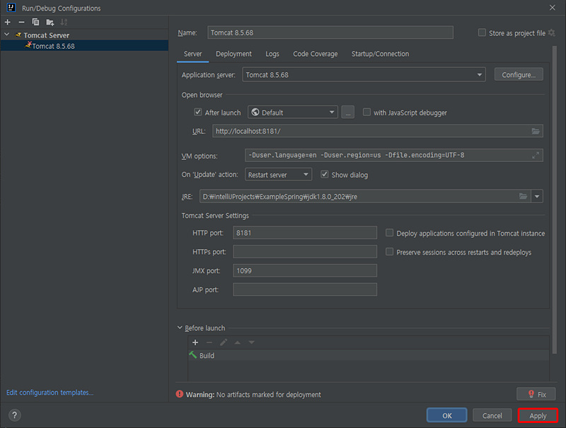 Deployment 메뉴에서 Deploy at the server startup부분에는 [+] 버튼을 존재한다.