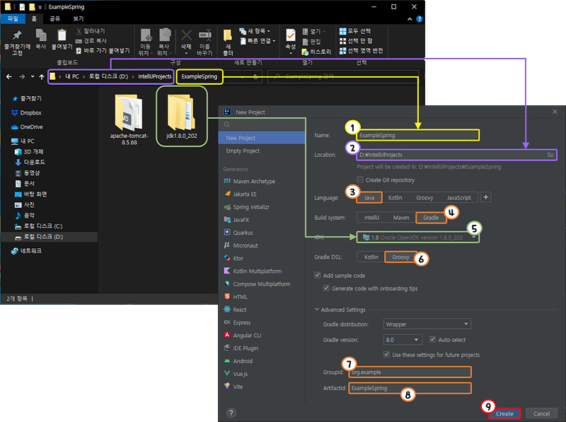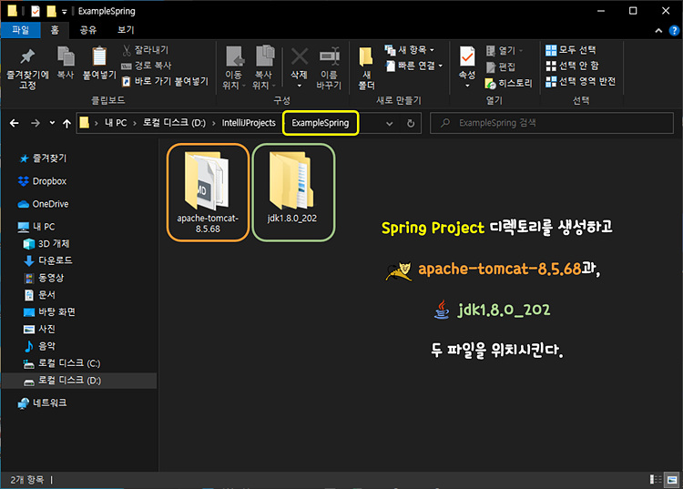 IntelliJ IDEA의 작업 디렉토리 경로에 ExampleSpring 이라는 프로젝트 폴더를 생성하고