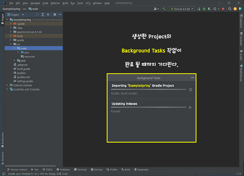 프로젝트에 필요한 라이블러리와 모듈 등의 설치가 모두 완료될때가지 기다린다.