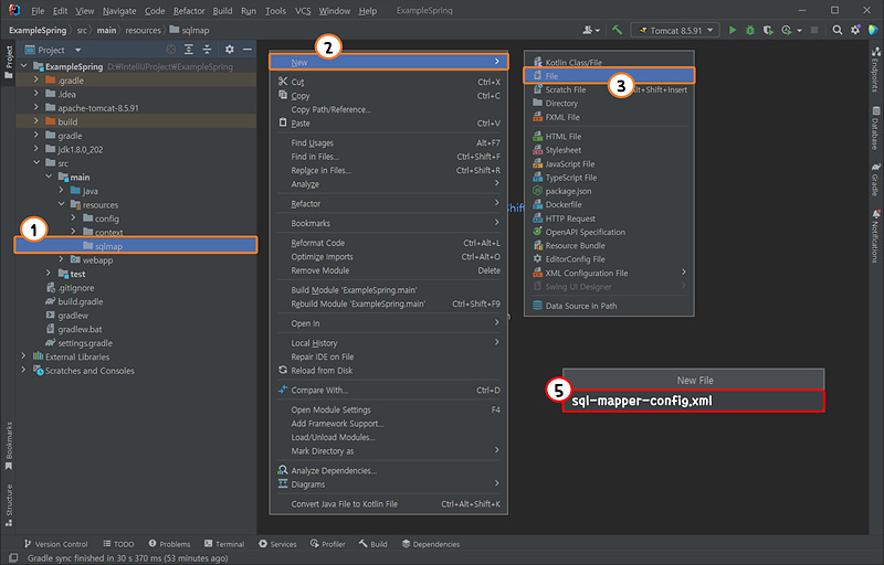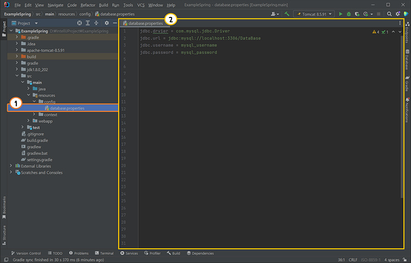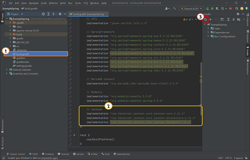 Spring 프로젝트에서 MyBatis 프레임워크를 사용하기 위해build.gradle을 열고 아래 패키지들을 추가하여 준다.