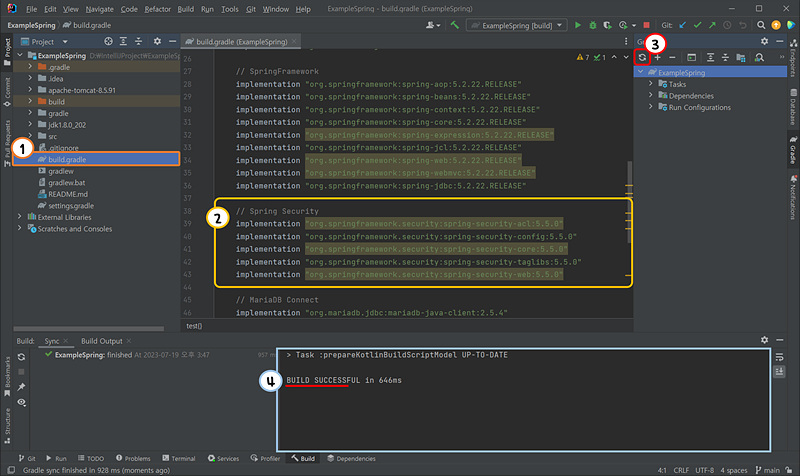 build.gradle을 열고 Dependencies에 스프링 시큐리티 라이브러리 추가하여 준다.