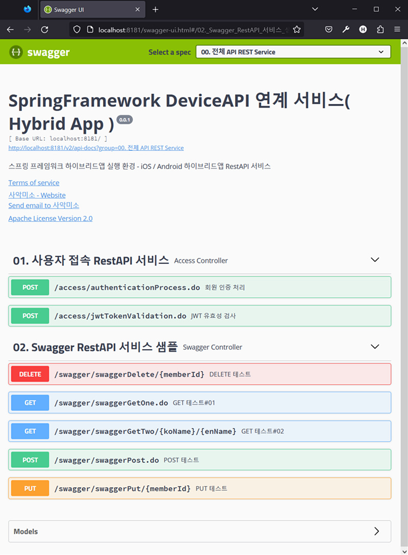 상단 Select a spec에서 01. 사용자 접속 RestAPI 서비스 를 선택하고