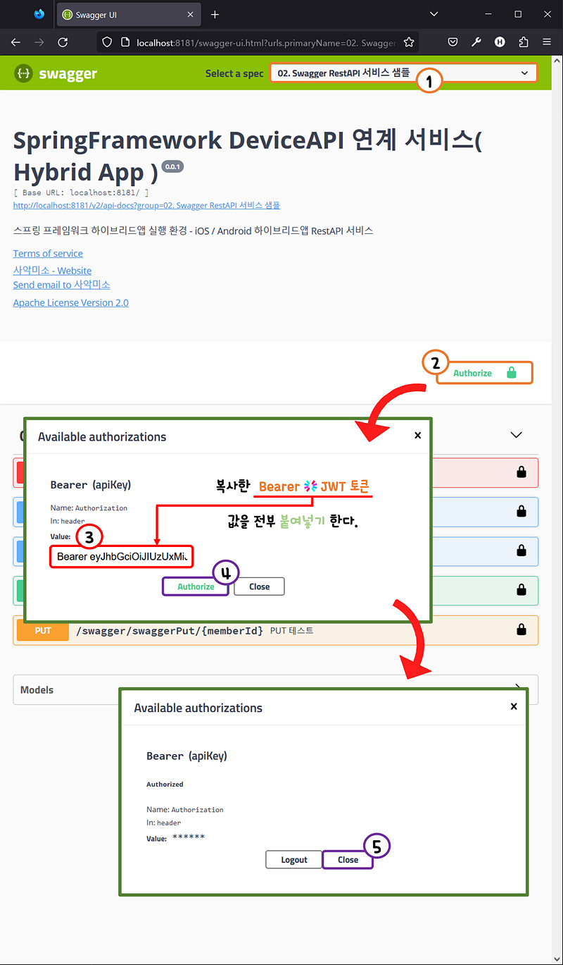 Bearer JWT_Token 값을 붙여넣기 하고 Authorize 버튼을 클릭한다.