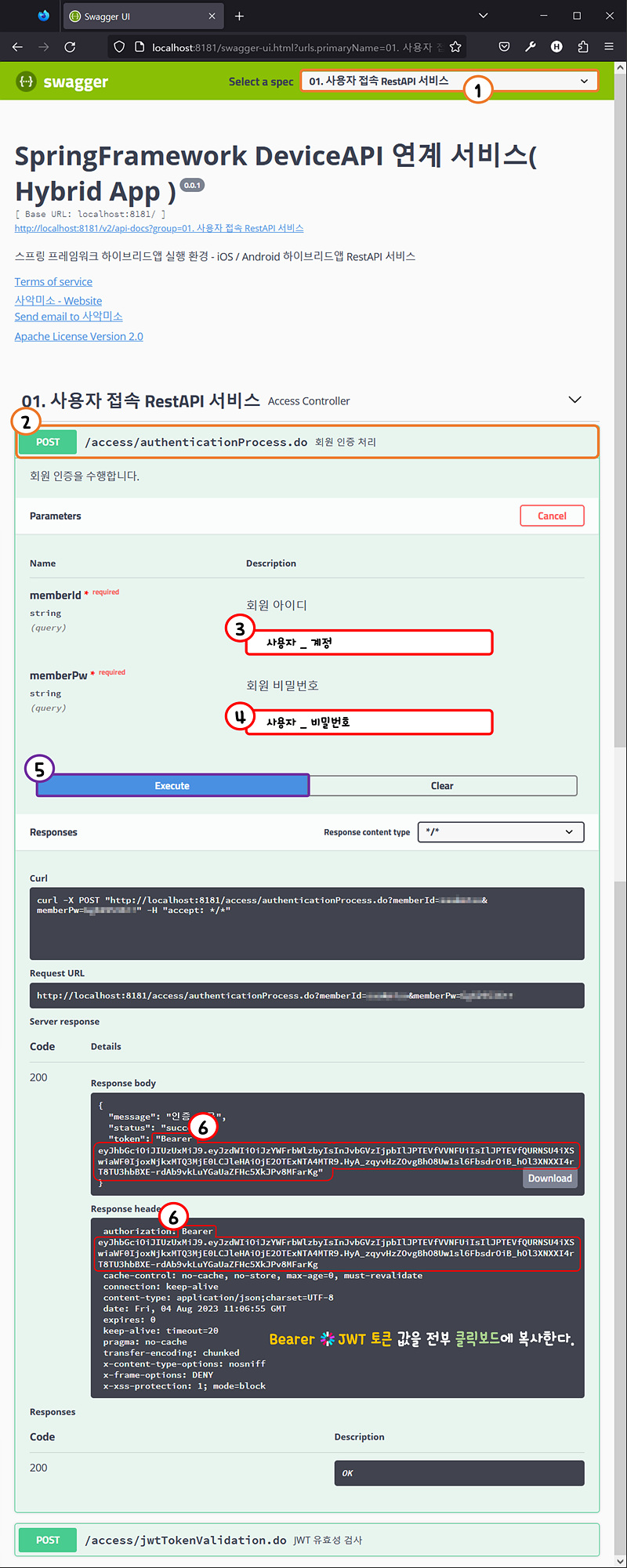 사용자_계정, 사용자_비밀번호를 입력하고 JWT 토큰을 발급받는다.
