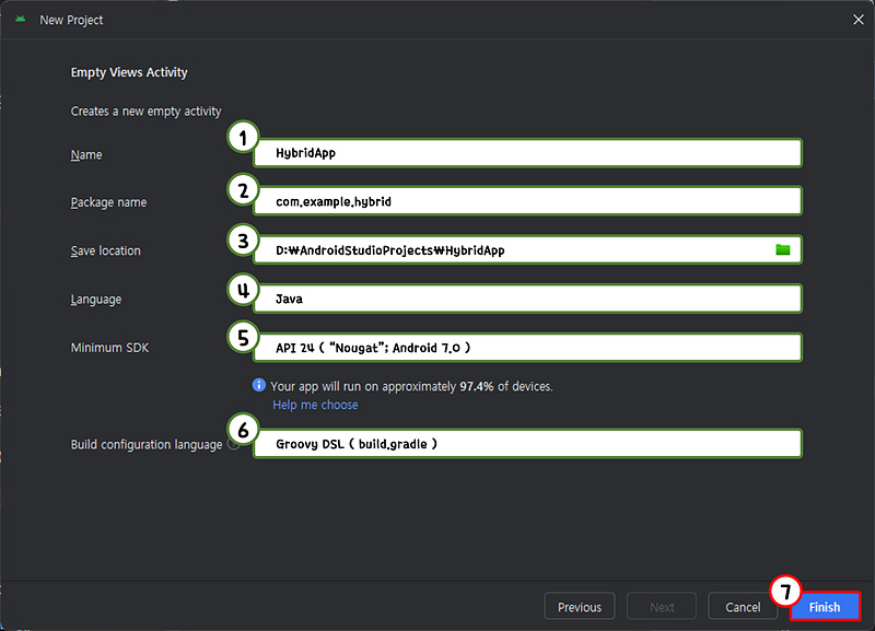 기본적인 Empty Views Activity를 사용하기위해 아래와 같이 값을 입력하여준다.
