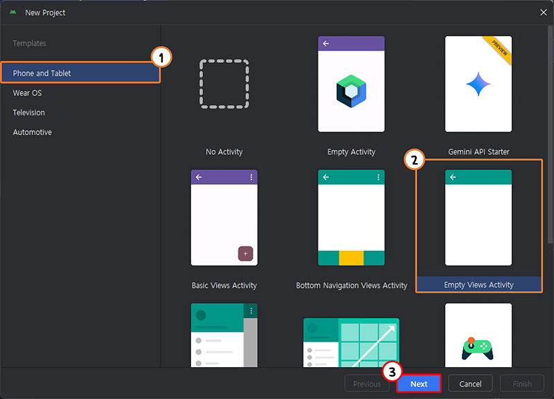 좌측 메뉴에서 Phone and Tablet을 선택하고 Empty Views Activity를 선택하여 준다.