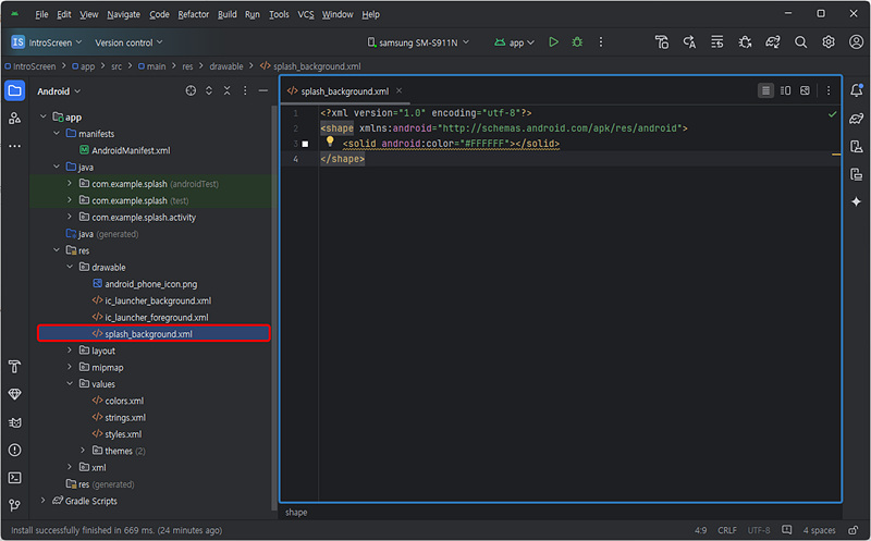 배경 색상의 컬러를 지정할 splash_background.xml 파일을 drawable 디렉토리에 생성하여 준다.