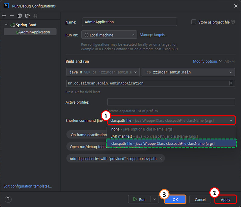 Shorten command lin 드롭다운 메뉴에서 classpath file 혹은 JAR manifest중에 택일하여 준다.