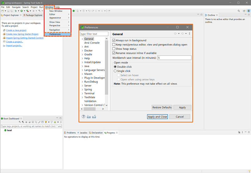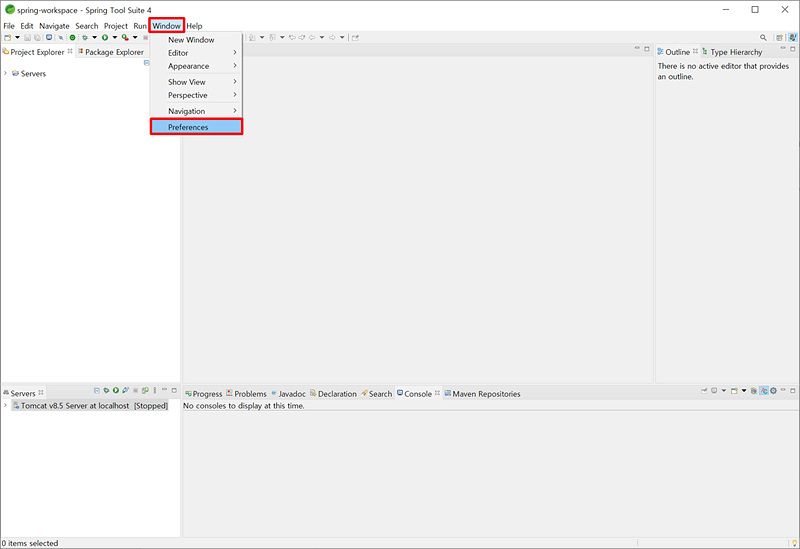 이제 STS IDE에서 Windows → Peferences( 설정 ) 창을 오픈하여 설정을 마무리 해보자.