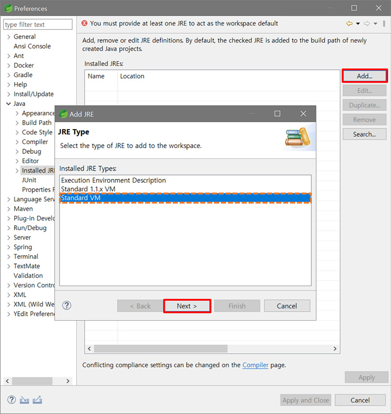 삭제가 완료되면 Add 버튼을 클릭하여 사전에 Download한 JRE를 지정해줄 것이다.