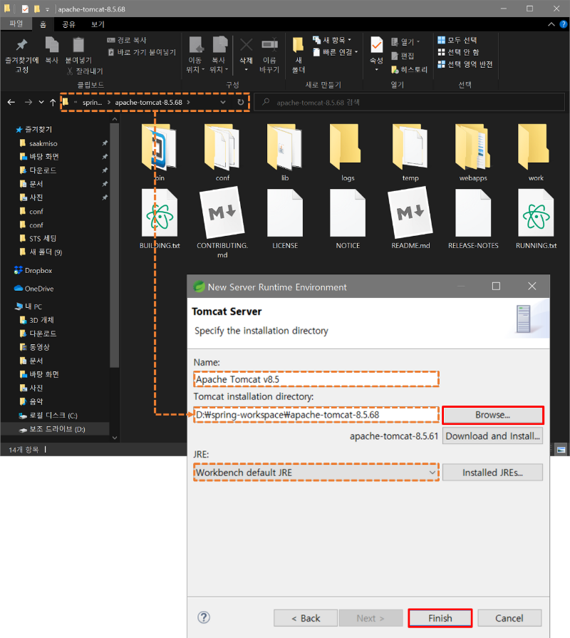 사전에 다운로드 및 압축을 해제한 spring-workspace의 apache-tomcat-8.5 버전의 디렉토리를 지정해준다.