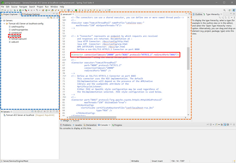 여기서 Servers\Tomcat v8.5 Server at localhost-config\ 경로의 server.xml 파일을 수정해 주도록 한다.