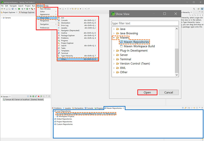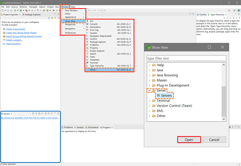 이제 마지막으로 STS IDE에서 Window → Show View → Other 버튼을 클릭하여