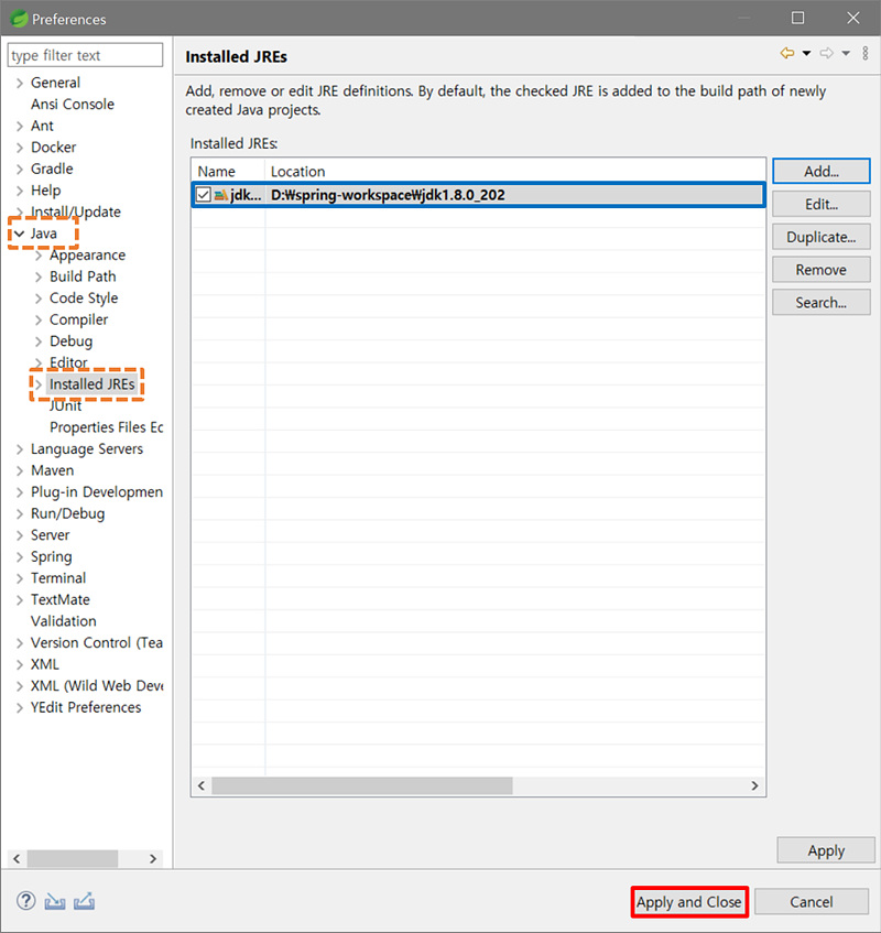 Apply and Close 버튼을 클릭하면 STS IDE에서만 사용할 Java JDK 1.8 버전 세팅이 완료된다.