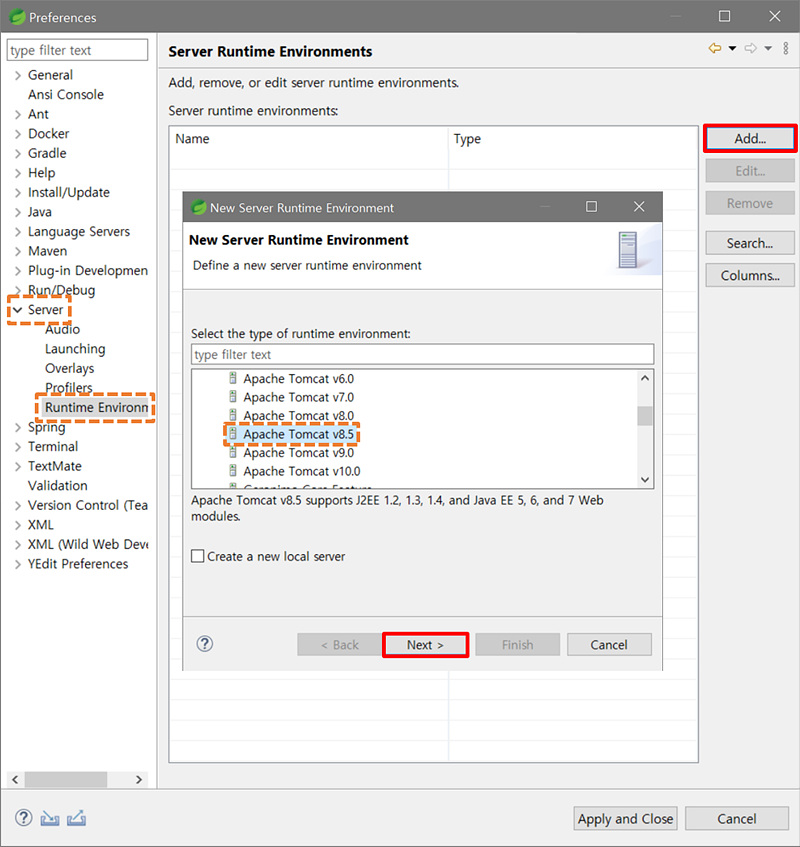 외쪽 카테고리 메뉴에서 Server → Runtime Environn 을 선택하여