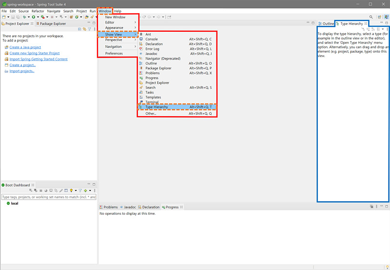 위에서 우리는 STS IDE의 Show View 기능을 활용하여 IDE에서 사용할 구성을 추가해주었다.