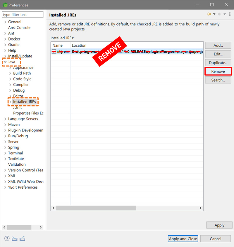Remove 버튼을 클릭하여 해당 JRE를 삭제해준다.