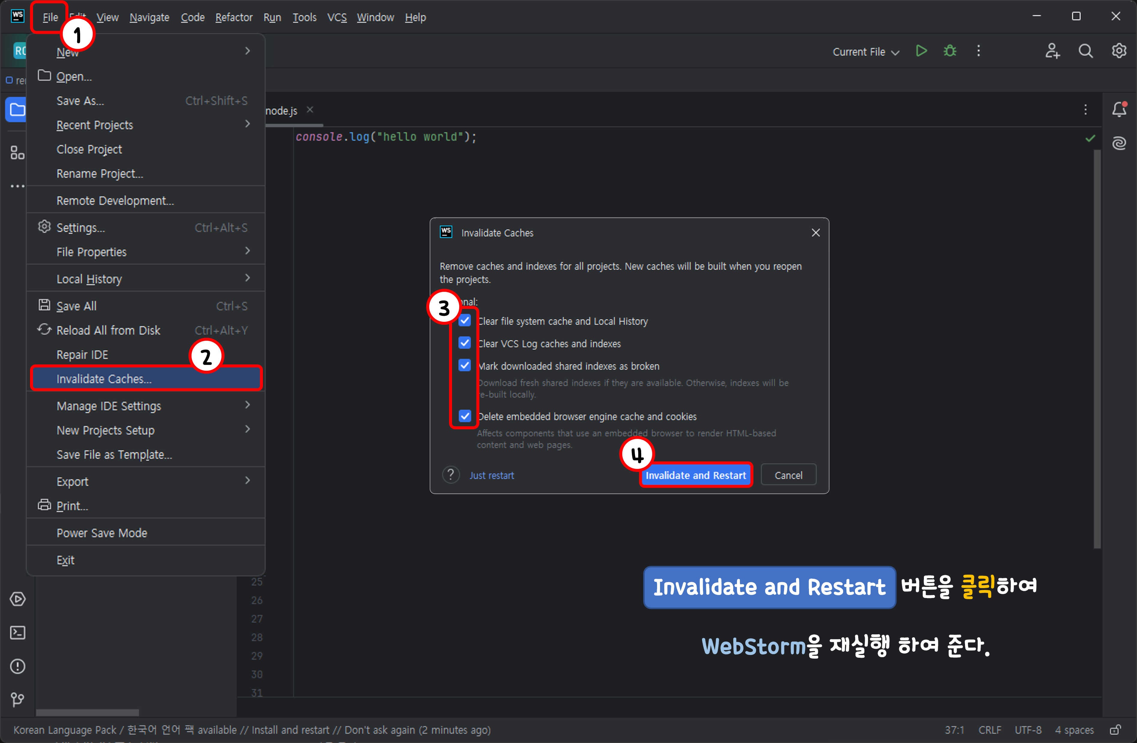 다시 WebStrome 상단의 File 메뉴를 선택하고 Invalidate Caches를 선택하여 준다.