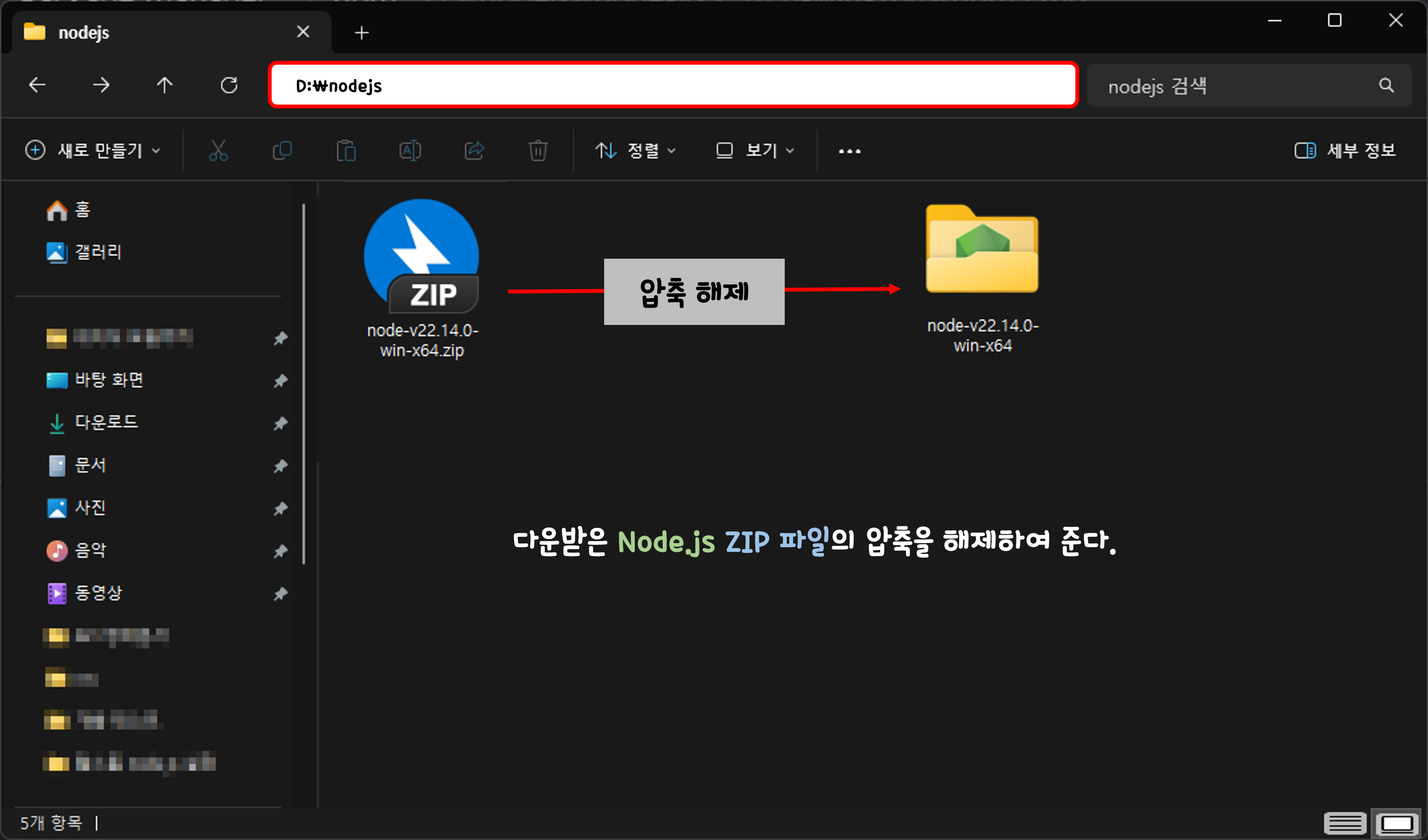 다운로드 받은 node-버전.zip 파일의 압축을 해제하여 준다.