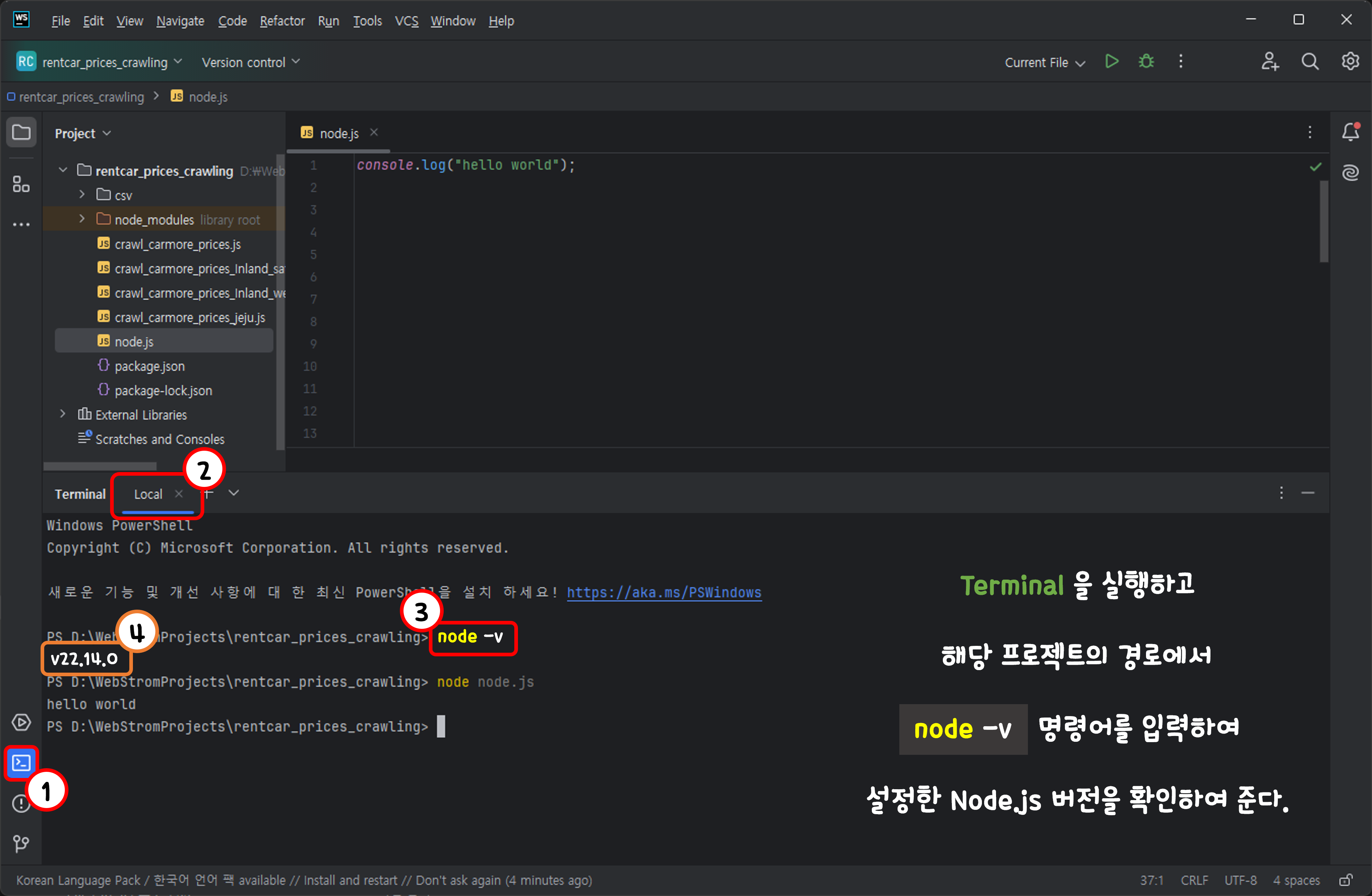Terminal창이 실행되면 node -v 라고 입력해 보자.