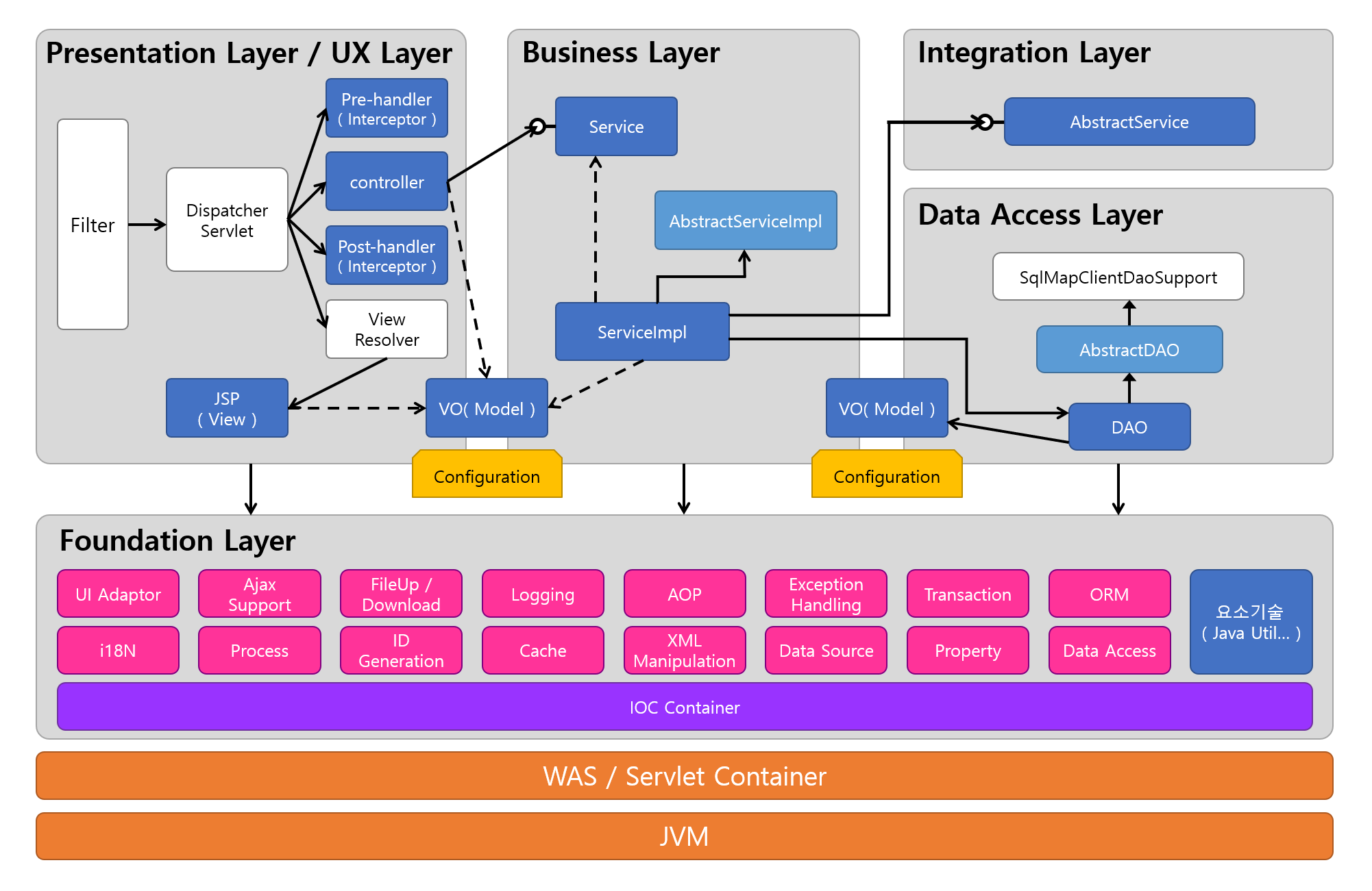 · 프레젠테이션 레이어는 DispatcherServlet과 Controller, JSP 등으로 구성된다.