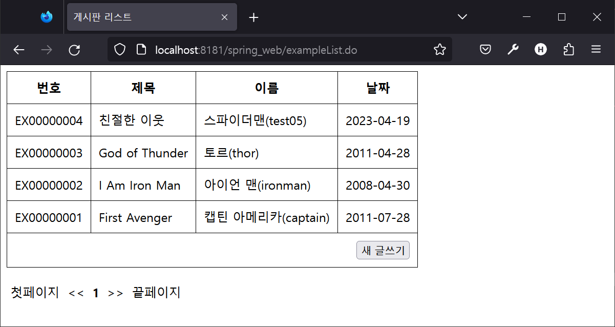 먼저 EXAMPLE_BOARD 라는 신규 테이블 생성하고, 초기데이터를 추가하여준다.