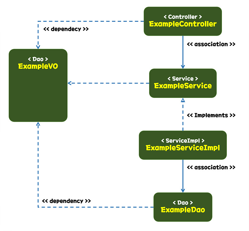 의존 관계( dependency )는 함수 호출 관계를 의미한다. implements는 클래스가 인터페이스를 구현하는 관계를 나타낸다.