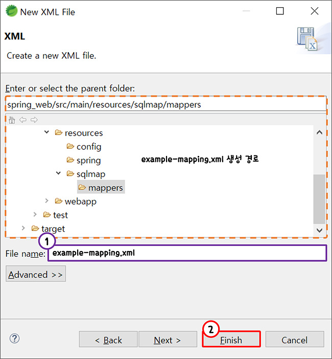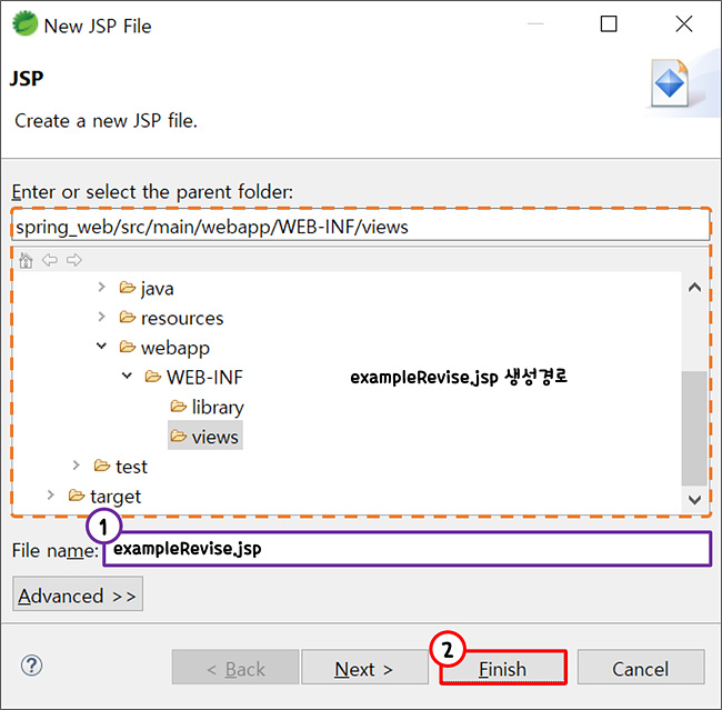 Finish 버튼을 클릭하여 exampleRevise.jsp 파일을 생성한다.