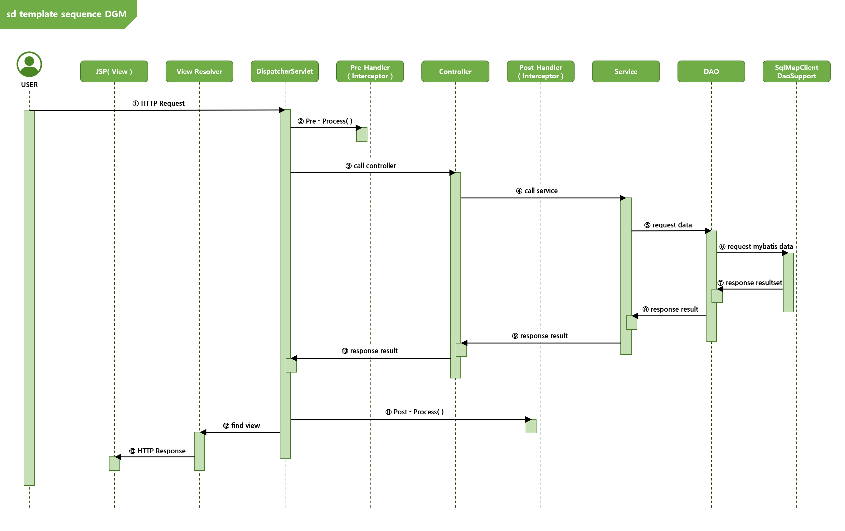 User는 맨 처음 DiapatcherServlet 클래스 요청을 보낸다.