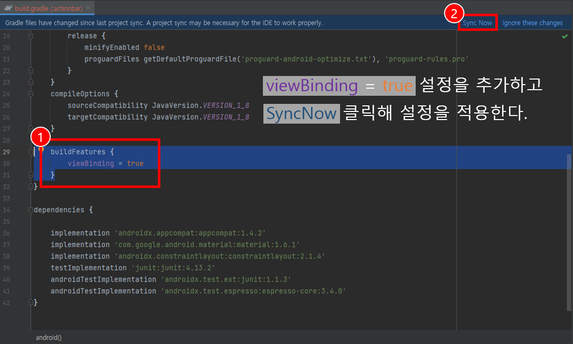 viewBinding 설정을 추가하였다면 Sync Now를 클릭하여 설정을 반영한다.